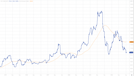Iron Ore – a key commodity used in steel production & linked to economic activity, is down over 50% since mid-2021.