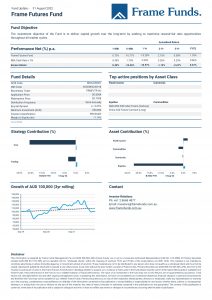 Units of the Frame Futures Fund appreciated by +0.73%. The Fund’s trading strategies added +0.66%, while the core strategy added +0.32%.