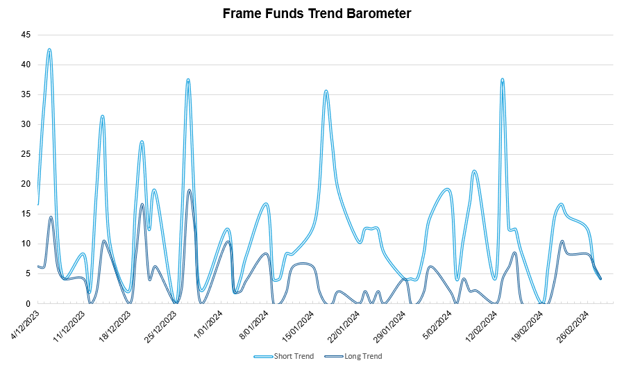 Below shows our proprietary trend-following barometer which captures the number of futures contracts within our universe hitting new short and long-term trends.